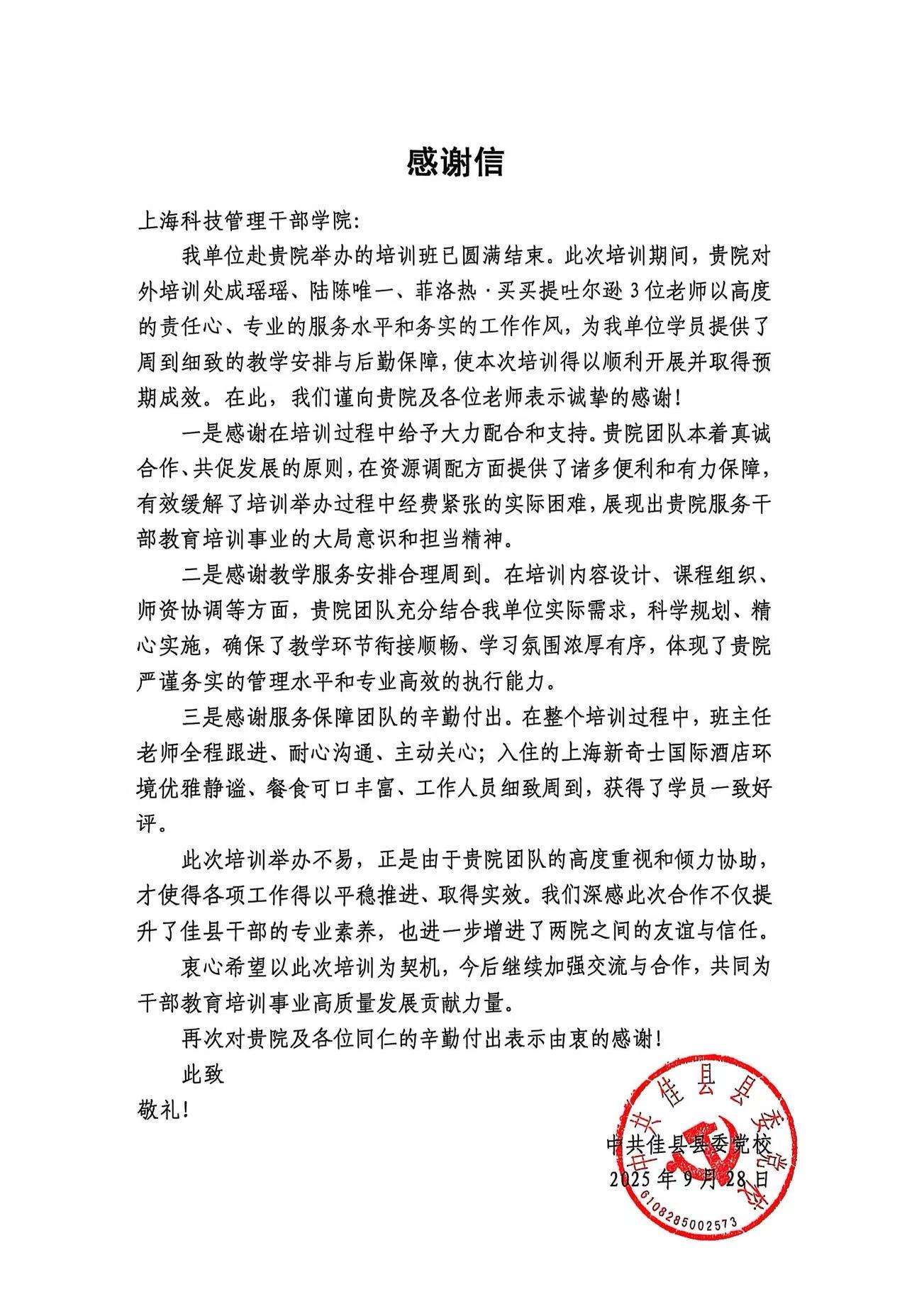 培训结束后,佳县县委党校发来感谢信,对我院提供的全力支持与周到服务表示诚挚感谢。信中特别提到,对外培训处相关老师以高度的责任心和专业的服务水平,在课程设计、教学组织、后勤保障等方面做了大量细致工作,有效保障了培训的顺利实施并取得预期成效。